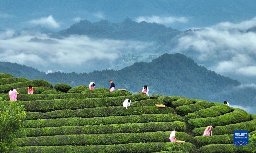 7月5日,茶农在贵州省岑巩县客楼镇下寨村茶山采摘云雾茶(无人机照片)。新华社发(胡攀学摄)