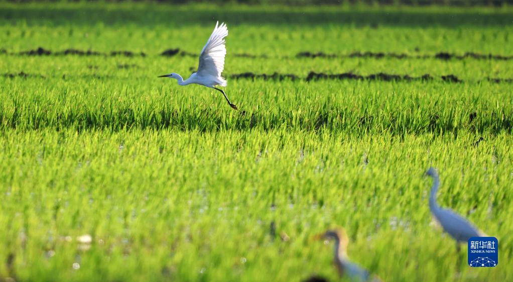 7月5日,白鹭在山东省临沂市郯城县郯城街道水稻田间飞舞。新华社发(张春雷摄)