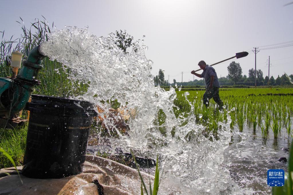7月5日,农民在山东省淄博市高青县芦湖街道大芦家村为水稻田浇水。新华社发(张维堂摄)