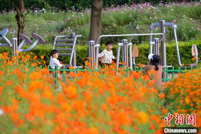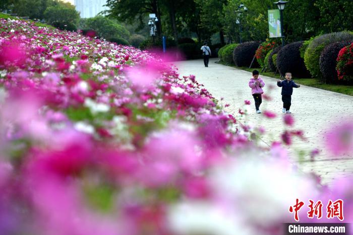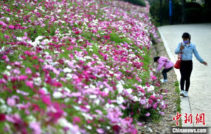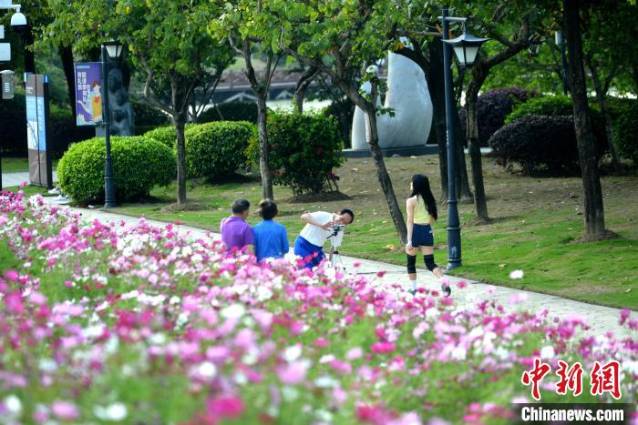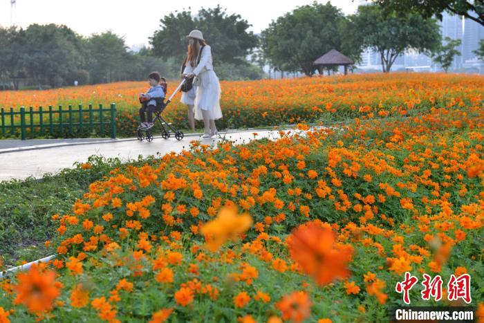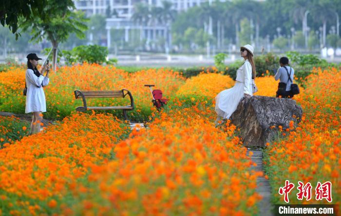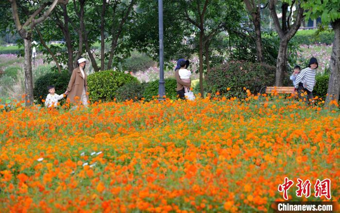 近日,福州市闽江畔的花海公园,成片的波斯菊、硫华菊迎盛花期,吸引市民游客前去观赏。