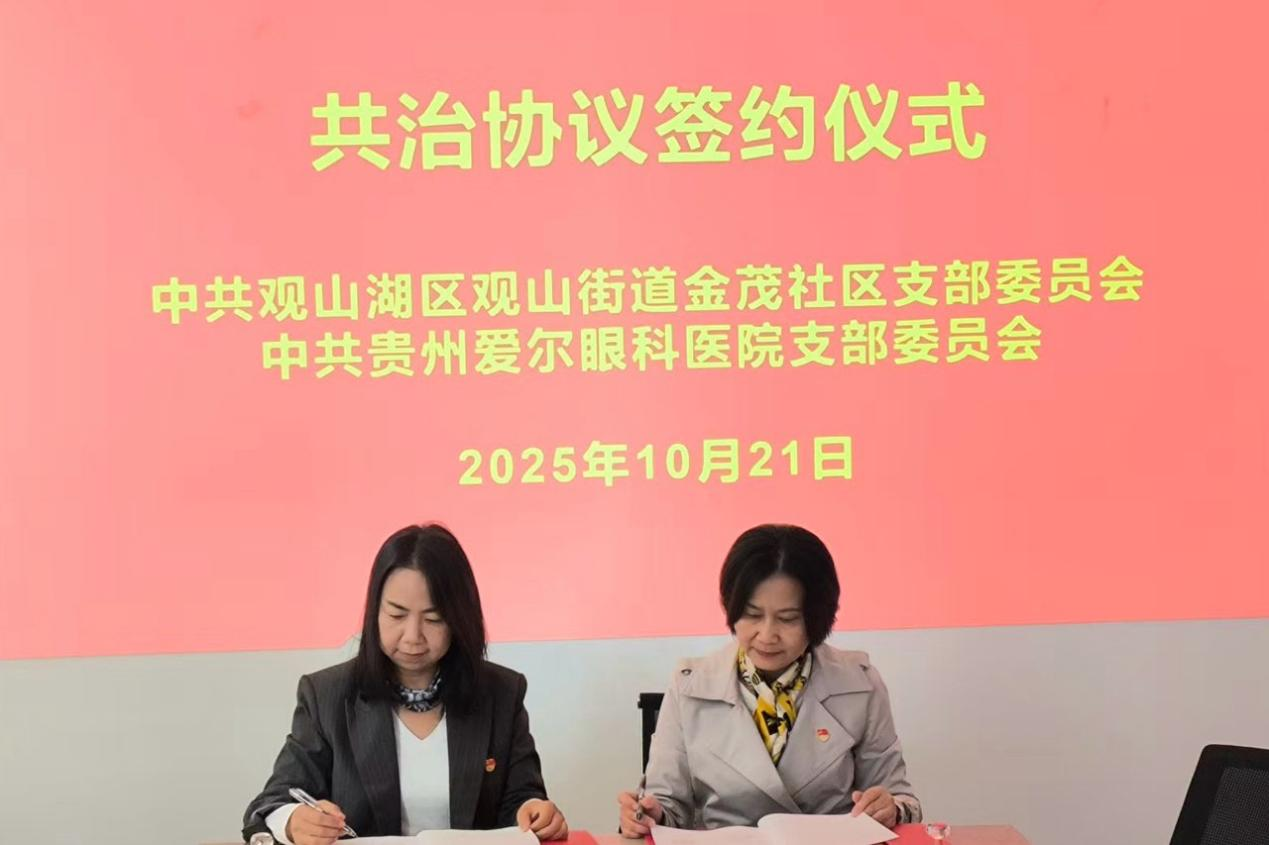 2025年10月21日下午,贵州爱尔眼科医院党支部委员会与观山湖区观山街道金茂社区支部委员会正式共同签署《共治协议》,并联合开展“医路光明·点亮睛彩”眼科义诊进社区活动。此次活动以党建联建为纽带,推动优质医疗资源下沉社区,是构建“资源共享、共驻共建、优势互补、共同发展”基层治理新格局的生动实践,受到居民广泛好评。