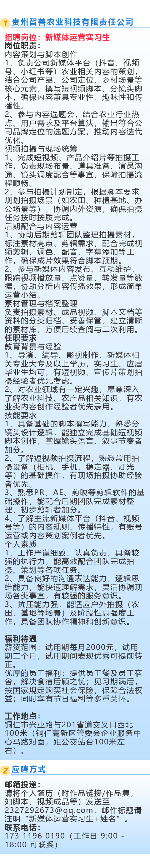 招聘新媒体运营实习生!提供员工餐及员工宿舍!