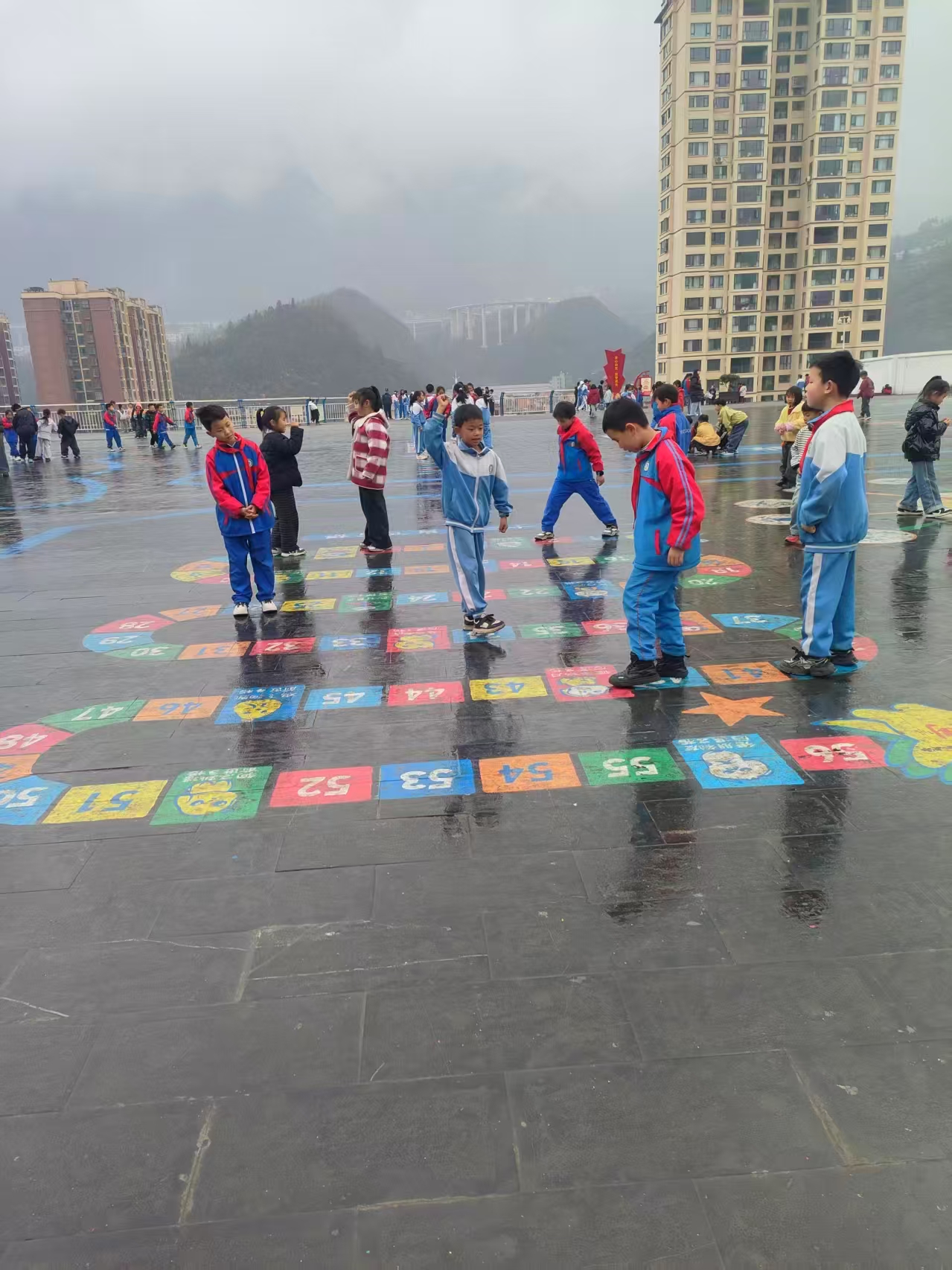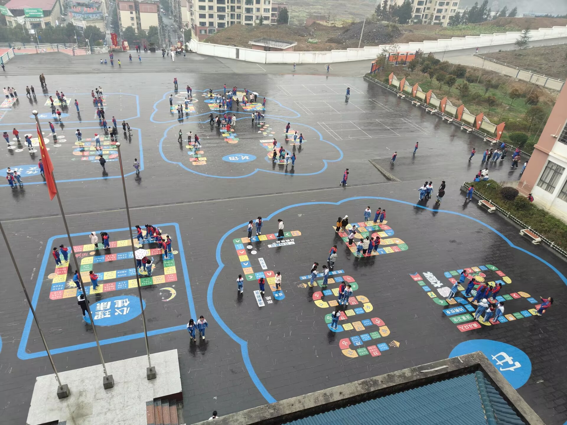 新学年新气象,赫章县野马川镇中心小学的学生们迎来了最特别的开学仪式。看,孩子们兴奋好奇地围在一个个色彩斑斓的地面游戏图案前,发出一声声赞叹。“我最喜欢玩成语接龙”“数学迷宫太有意思了”我跳远比较厉害”.......孩子们边玩边说,欢快的笑声在操场上空回荡。