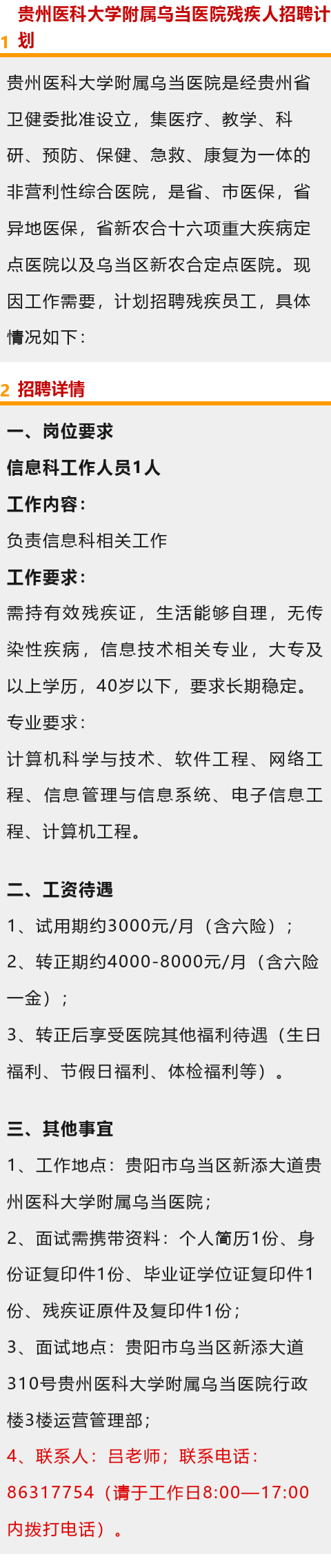 贵州医科大学附属乌当医院招聘残疾员工!月薪4000-8000元!六险一金!