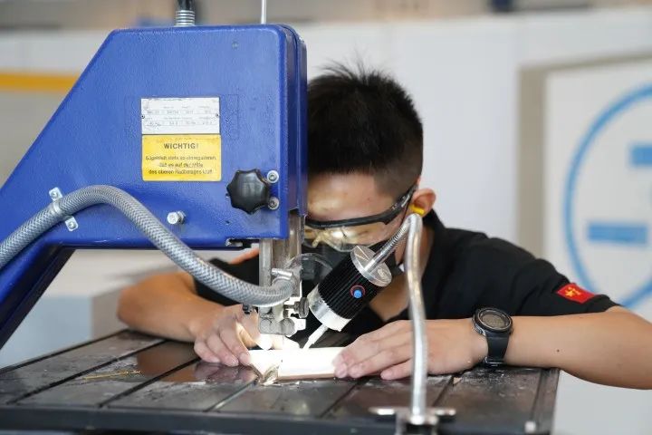 比赛中,林宇翔需要通过切割机从一块150×150mm的瓷砖中将图案切割出来。林宇翔说A模块最难的除了切割摩天轮图案外,就是进行镶贴。镶贴要对齐缝隙,需要特别观察每一条横缝与竖缝。“摩天轮中间的X缝隙要求6mm,这也是比赛难点之一。”