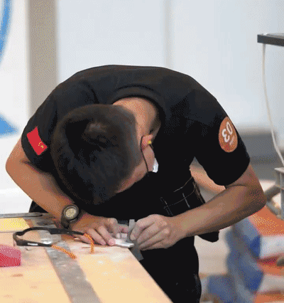 比赛不仅工程量大,还会为选手制造难点。当时,林宇翔分到的比赛墙面误差很大,比赛第一天就耗费了大量时间将墙面抹平。另外,他施工所站的位置还有一个井盖,踩在上面井盖就会晃动,很难保持平衡。