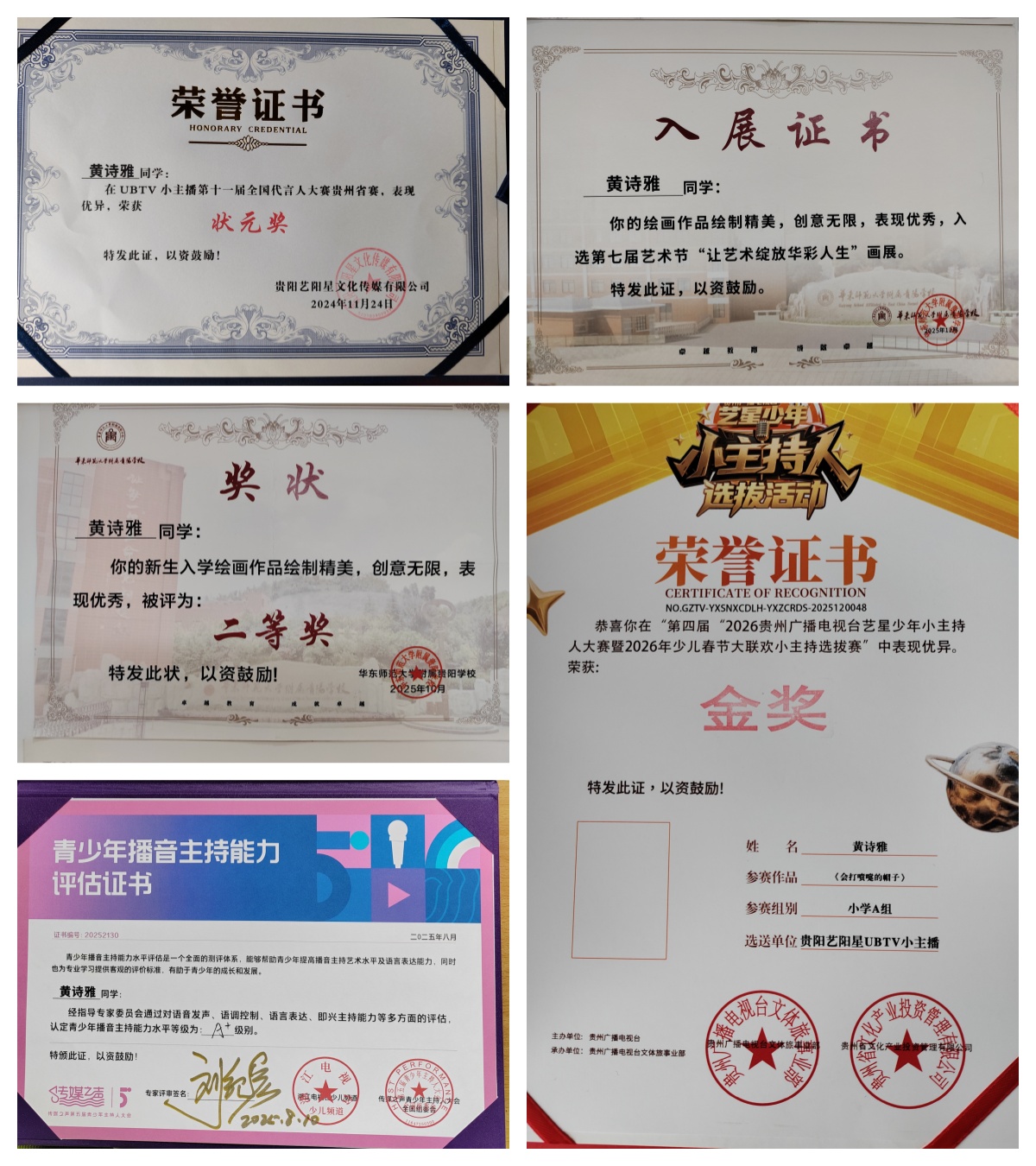 3.2025年,第四届贵州广播电视台艺星少年小主人大赛金奖;