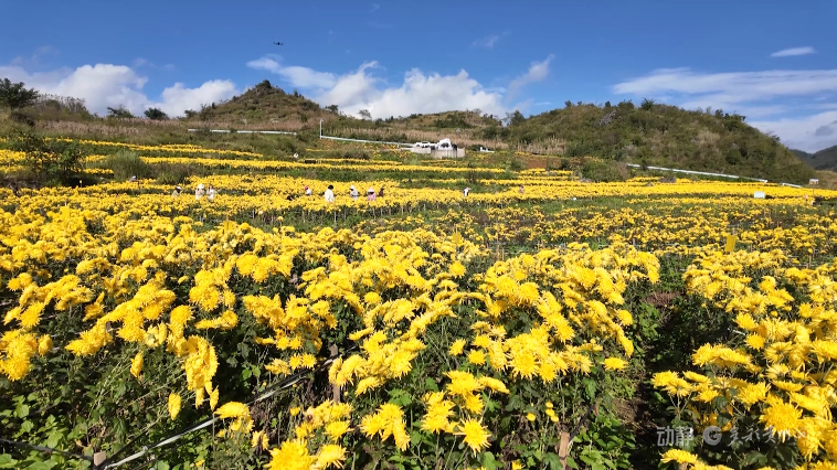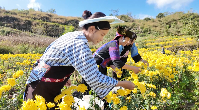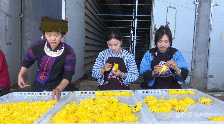 花田里,数十位村民忙碌穿梭其间,娴熟地将花朵采摘入篓。这些刚采摘下来的金丝皇菊被送至加工厂进行分拣、晾晒、烘干处理,制成养生茶饮,销往全国各地。