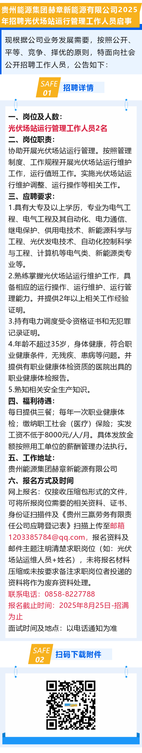 【国企】贵州能源集团赫章新能源有限公司招聘!月薪不低于8000元!提供三餐!