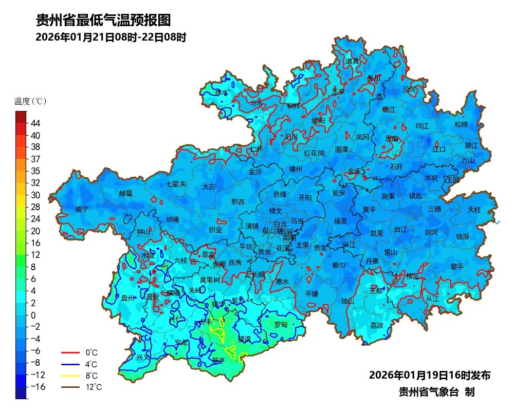 贵州省气象台1月19日16时发布低温凝冻蓝色预警: