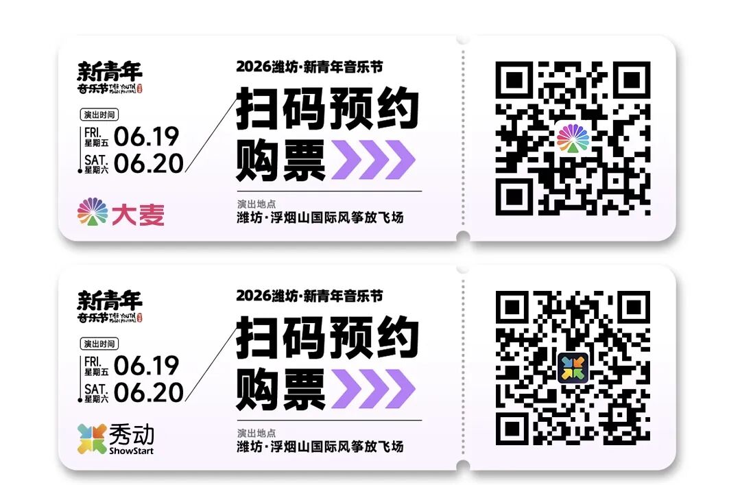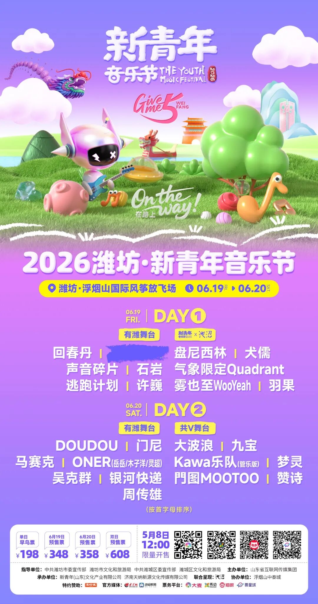 2026年6月19日—20日,两天时间,有潍、共V(6月19日共V舞台由新青年×池沼联合呈现)双舞台阵容,让音浪穿透夏日,让热爱响彻潍坊。这里有懂音乐的城市,有热忱的乐迷,有“音乐扎根,热爱生长”的初心延续,更有“五载赴潍,声生不息”的全新篇章。