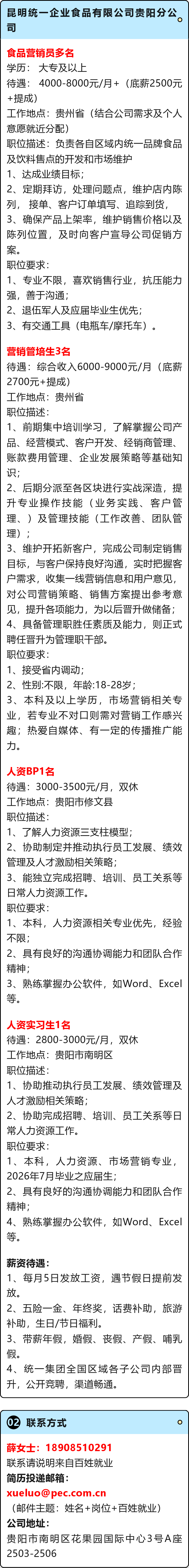 【知名企业】昆明统一企业食品有限公司贵阳分公司招聘!月薪可达9000元!