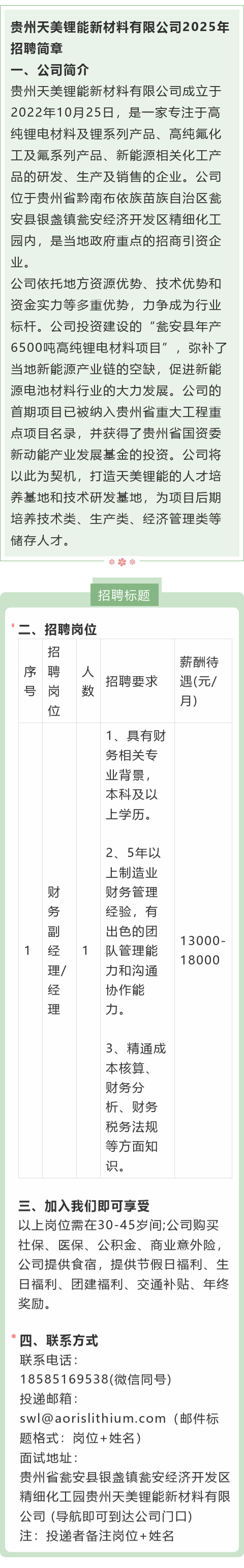 贵州天美锂能新材料有限公司招聘!月薪13000-18000元!提供食宿+年终奖!