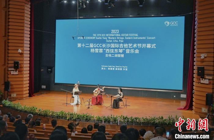 当古典吉他遇上二胡、琵琶,共同演绎出《彩云追月》《渔舟唱晚》《梁祝》等名曲,中西弦乐碰撞给观众带来与众不同的音乐享受。8月5日晚,世界知名吉他演奏家杨雪霏与二胡演奏家薛辰茜、琵琶演奏家孙莹,联手呈现了一台“西弦东琴”音乐会,也由此拉开了第十二届GCC长沙国际吉他艺术节的序幕。