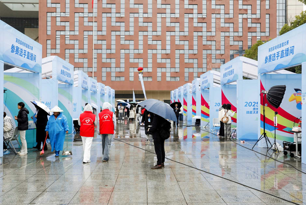 决赛当天,学生赛道几十个直播间在位于清镇的电商职业学院校内广场同时开播,声浪交错,灯光闪烁,像一场小型电商嘉年华。
