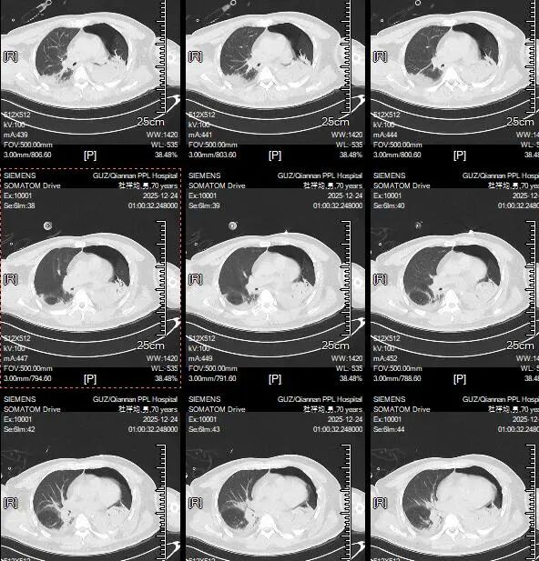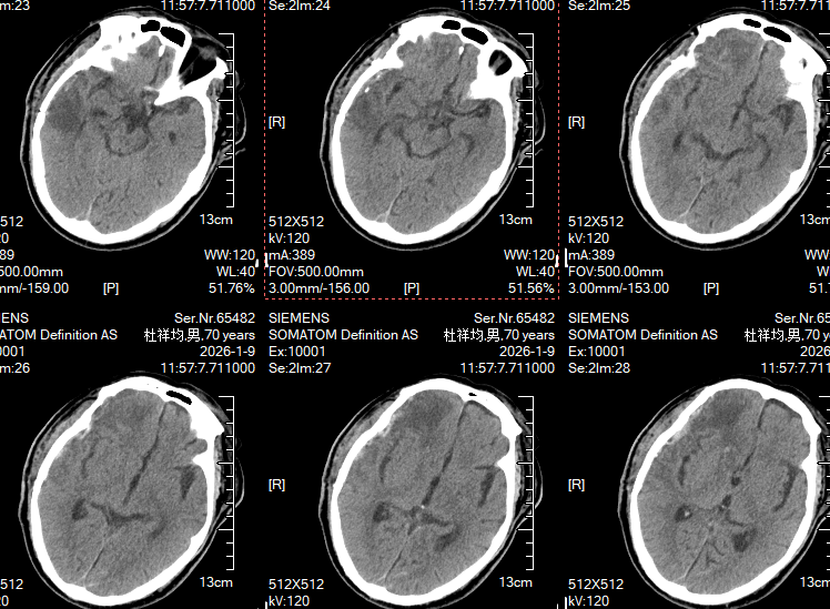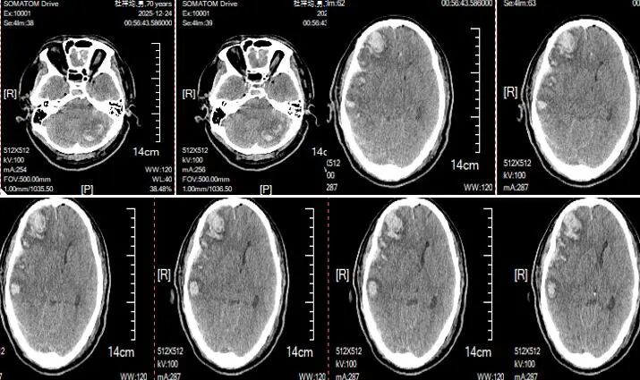 患者入院时已处于深昏迷状态,无自主呼吸,血压持续偏低,需依靠大剂量升压药维持;右侧瞳孔散大,提示脑疝形成,同时伴有严重创伤性休克、血氧饱和度仅82%,以及肋骨及骨盆多发骨折、双侧血气胸和腹腔脏器损伤等多系统损伤。神经外科重症监护室立即开启创伤救治绿色通道,在积极进行重症支持的同时,迅速完成相关检查与评估。