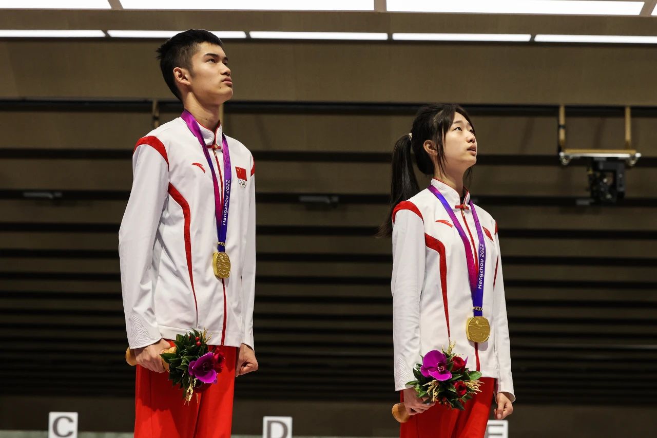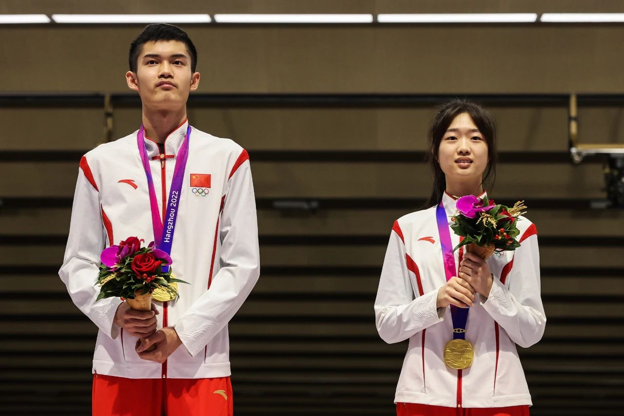 9月26日,中国选手盛李豪(左)、黄雨婷在颁奖仪式上。新华社记者 单宇琦 摄
