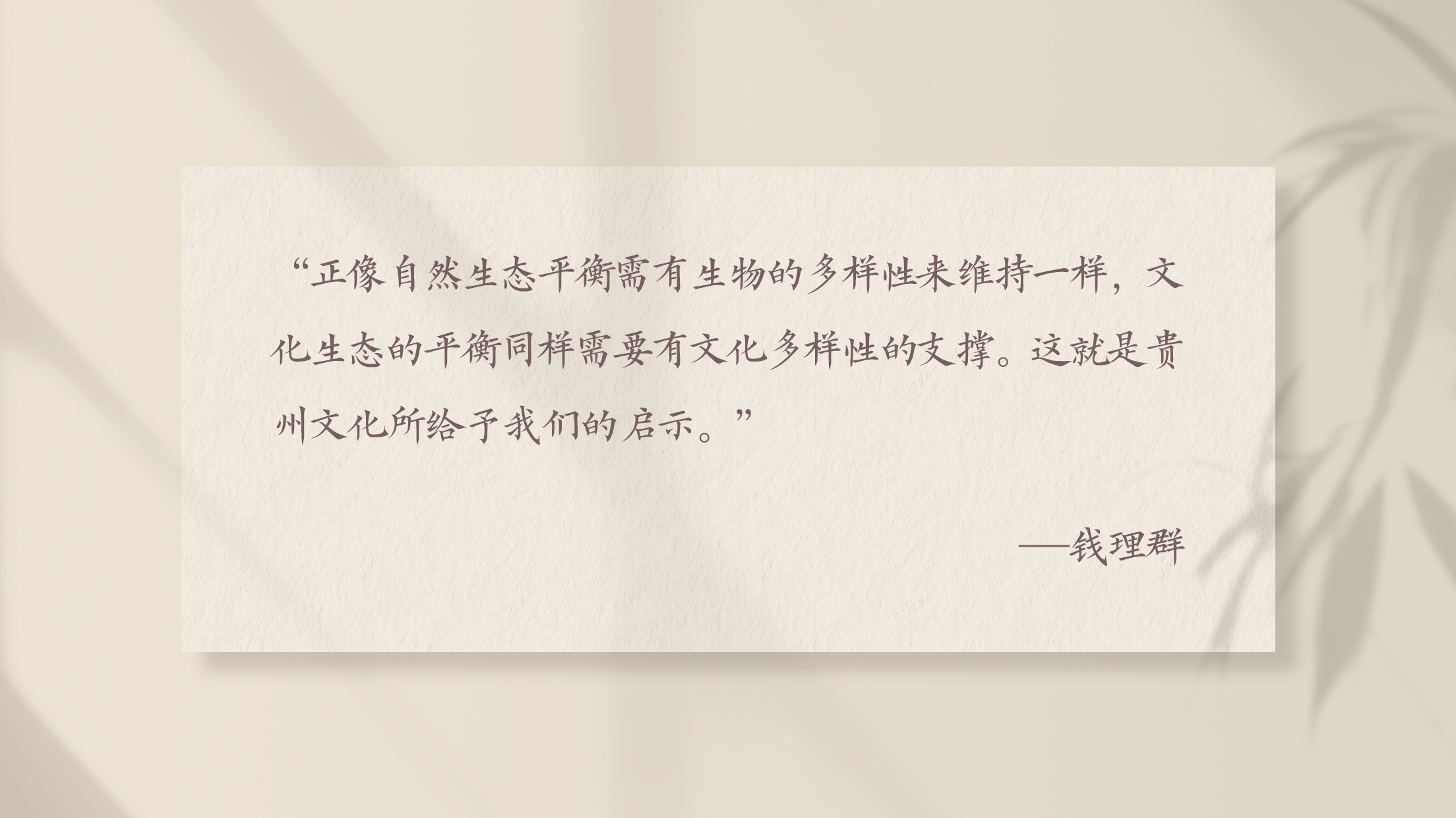 钱先生对贵州文化有着独到而深刻的认识。他将贵州文化概括为“三个和谐”与“两个平衡”:人与自然的和谐、多民族共处的和谐、多种文化共存的和谐;自然生态的平衡与文化生态的平衡,即具有很大的包容性。他精辟地指出:“正像自然生态平衡需有生物的多样性来维持一样,文化生态的平衡同样需要有文化多样性的支撑。这就是贵州文化所给予我们的启示。”