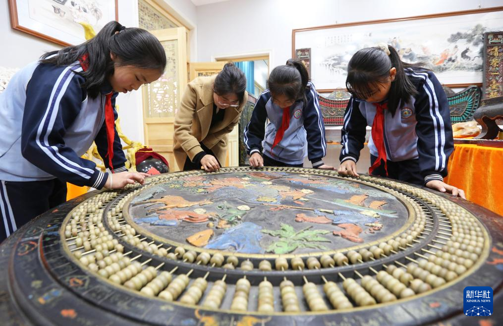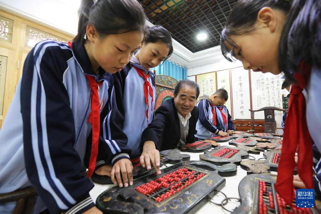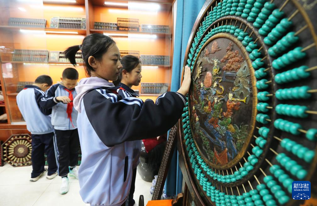 陇西县红星小学学生在程万里的算盘非遗体验基地参观。新华社发(王克贤摄)