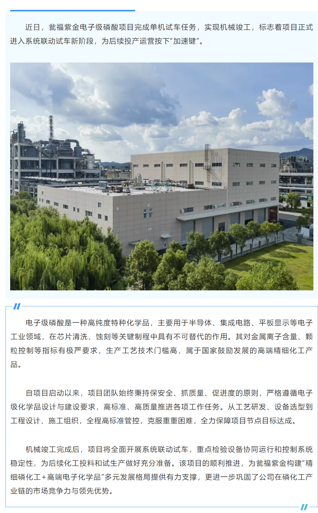 瓮福紫金电子级磷酸项目实现机械竣工