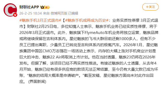 据财联社:多位知情人士表示,魅族手机业务已经实质性停摆,将于2026年3月正式退市。此外,魅族旗下FlymeAuto车机业务将独立运营,魅族品牌或将继续保留在吉利体系内。星纪魅族的飞书大群目前还剩1000多人,但有不少员工已提出离职,少量员工已转岗至吉利体系内的极氪汽车。