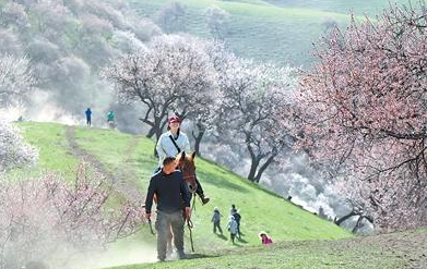 眼下,伊犁河谷万物复苏、春意盎然。在新疆伊犁哈萨克自治州新源县吐尔根乡杏花沟,原始野杏林正处于盛花期,漫山杏花吐蕊,景色美不胜收。近年来,当地进行保护性开发,发展“旅游+”业态,提升游客游览体验、拓展农牧民增收渠道。图为游客在杏花沟游览。本报记者 尚嵘峥摄