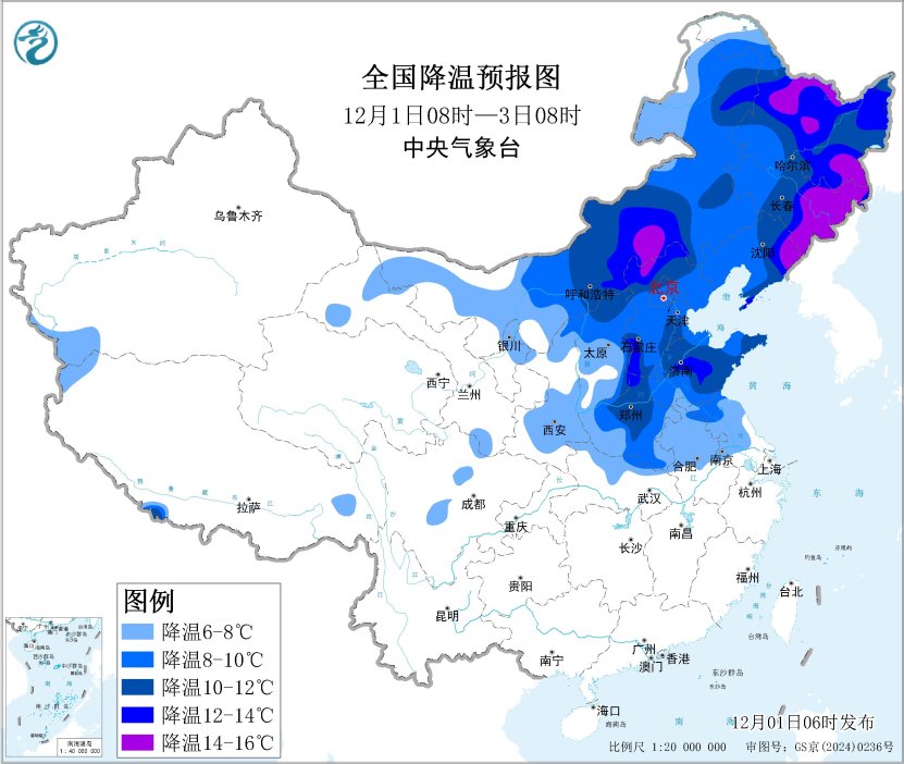 其中12月1日08时至3日08时,内蒙古中部、黑龙江中南部、吉林东部、辽宁东部、华北北部和南部、黄淮北部等地部分地区降温10~12℃,局地可达14~16℃。