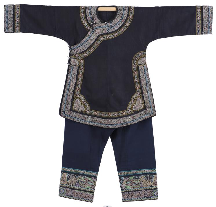 此盛装上衣为马尾绣大襟衣、挽袖,下装为直筒裤,裤脚口用马尾绣装饰,颈饰有多种银项圈,头戴银帽上插银角,手戴银手镯。