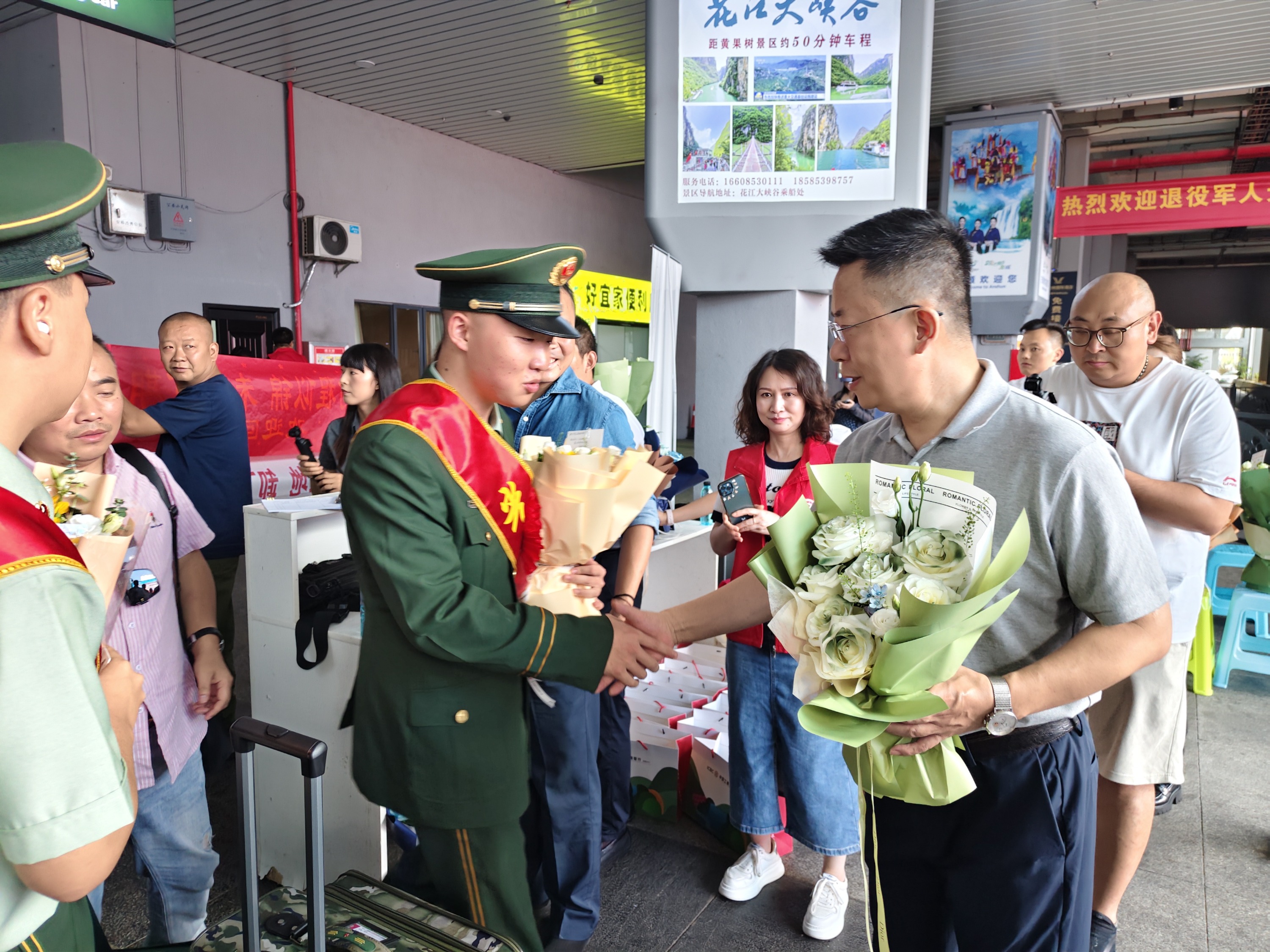 活动现场,各县(区)退役军人事务工作人员、拥军代表及退役军人家属早已在出站口高举欢迎牌、手捧鲜花等候。当身着军装的退役军人出现在人群中时,现场立刻响起热烈的掌声与欢呼声,返乡的退役军人们脸上洋溢着自豪又激动的笑容。随后,工作人员和拥军企业代表为他们送上鲜花与暖心大礼包,并陪同退役士兵及家属在活动背景墙前拍照留念,让他们第一时间感受到党委政府与社会各界的关心关爱,鼓励他们继续发扬军人优良传统,在新岗位上再创佳绩。
