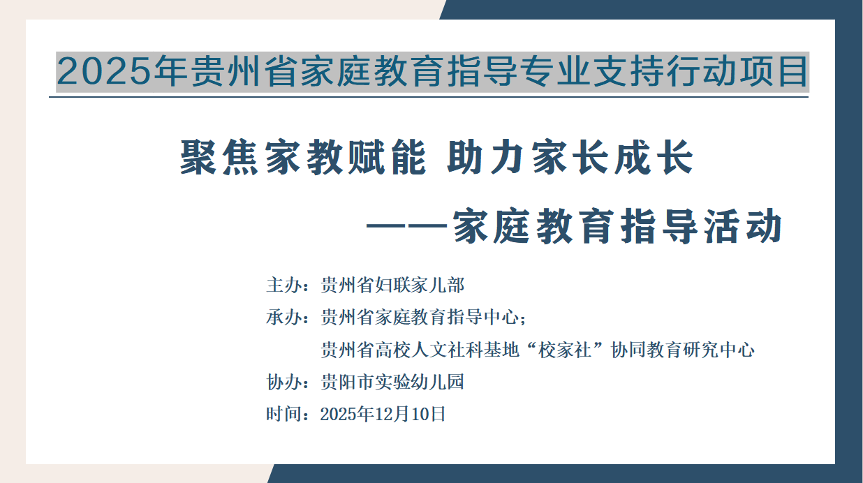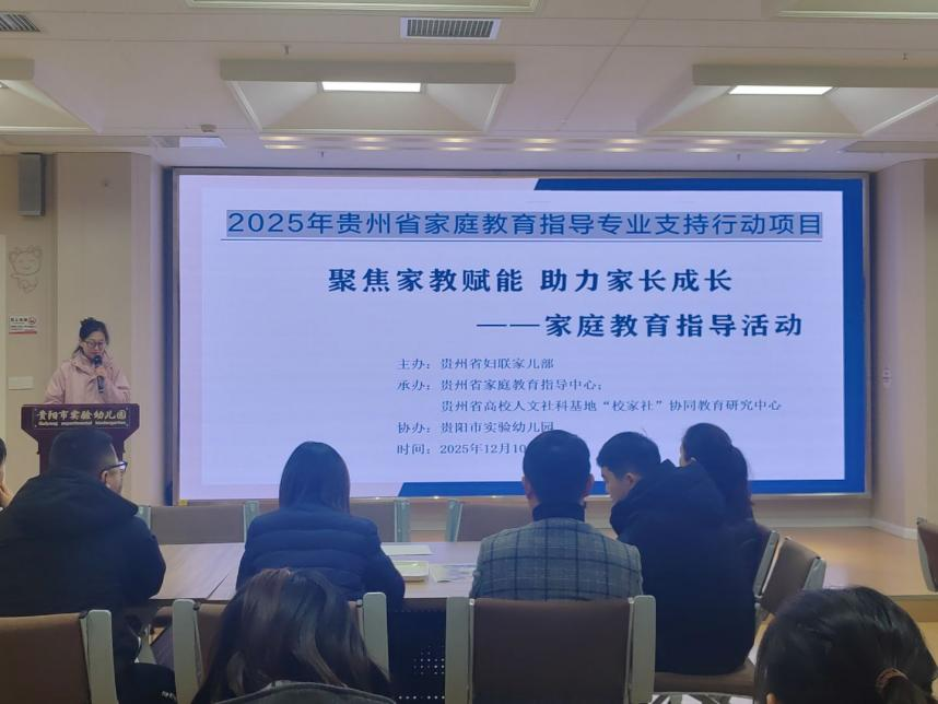 为扎实推进2025年贵州省家庭教育指导专业支持行动项目落地,由贵州省妇联家儿部主办,贵州省家庭教育指导中心、贵州省高校人文社科基地“校家社”协同教育研究中心承办,贵阳市实验幼儿园协办的《聚焦家教赋能 助力家长成长》家庭教育指导活动,于近期在贵阳市实验幼儿园总园顺利开展。
