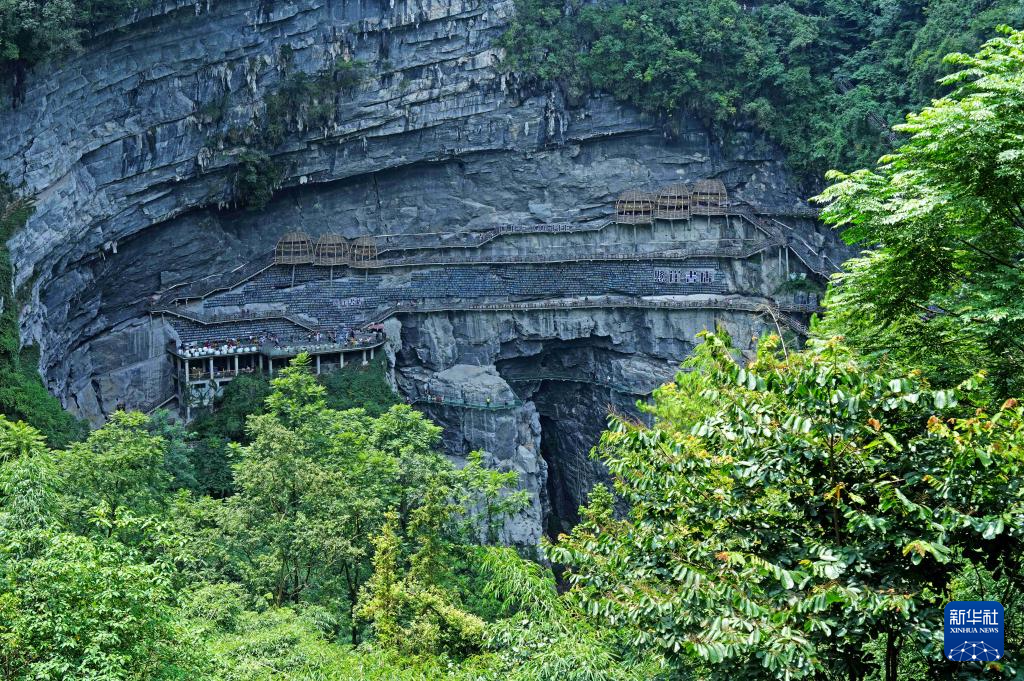 游客在广西河池市罗城仫佬族自治县棉花天坑景区内的悬崖书店游玩。新华社发(龙涛摄)