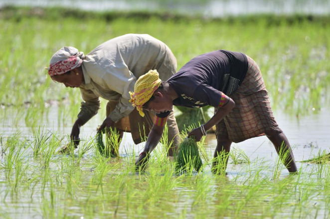 2023年7月5日,人们在印度阿萨姆邦一处稻田内种植水稻。新华社发