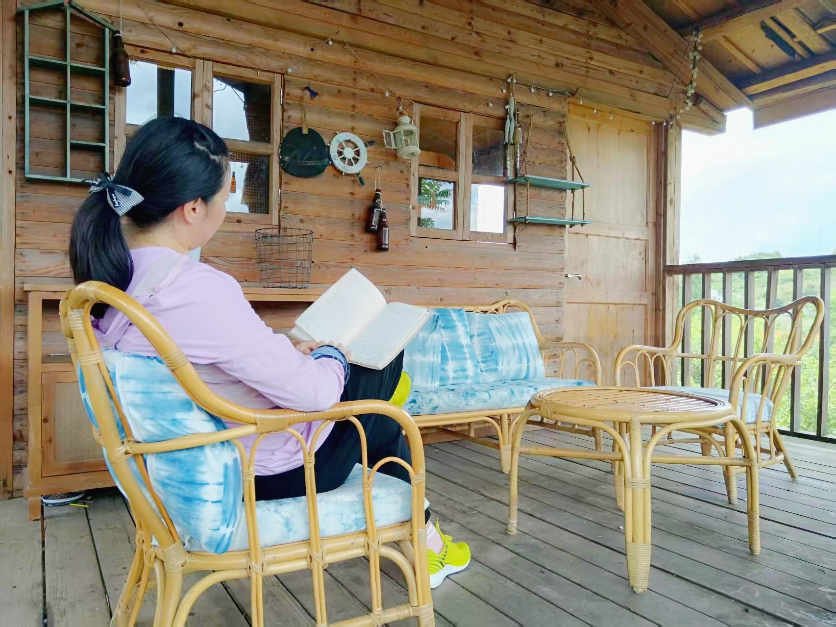 小木屋、木质置物架,藤编椅子和茶几,在这样的环境中阅读,宁静又惬意