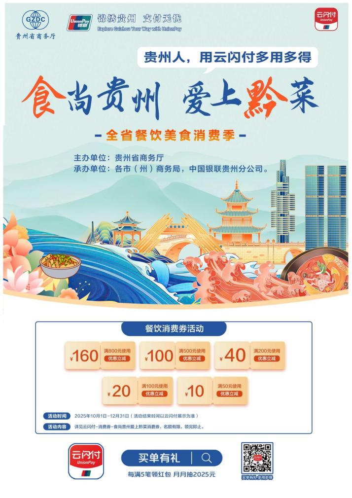 最高立减160元,2025年“食尚贵州・爱上黔菜”餐饮消费券10月1日起发放
