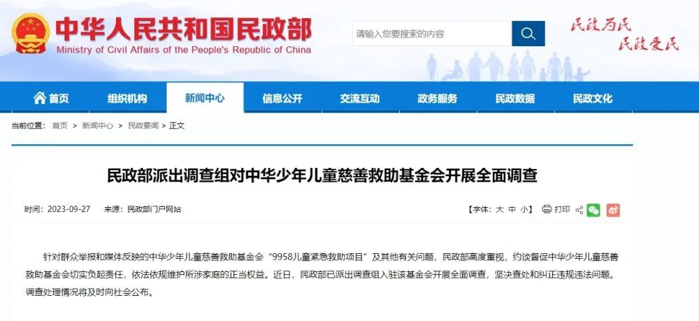 针对群众举报和媒体反映的中华少年儿童慈善救助基金会“9958儿童紧急救助项目”及其他有关问题,民政部高度重视,约谈督促中华少年儿童慈善救助基金会切实负起责任,依法依规维护所涉家庭的正当权益。近日,民政部已派出调查组入驻该基金会开展全面调查,坚决查处和纠正违规违法问题。调查处理情况将及时向社会公布。