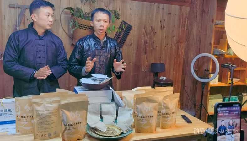晚上七点,从江县銮里侗寨的一个创业基地,吴增荣开始了直播,推销当地的瑶浴产品。