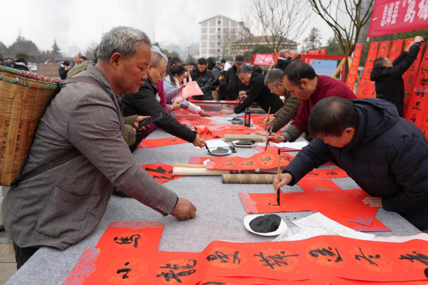 笔墨迎春,福送万家。广场一侧,书法爱好者们挥毫泼墨,一副副寓意吉祥的春联、一个个饱满的“福”字跃然纸上,传递着诚挚的新春祝福。群众纷纷驻足观赏、有序领取,手捧墨香浓郁的春联,脸上绽放出灿烂笑容。“‘福’字倒贴福就到!这字写得真漂亮,我特别喜欢。一会儿就贴到大门口,红红火火迎新年!”家住小寨坝镇复兴社区的梁建荣向记者展示着手中的“福”字,开心地说。