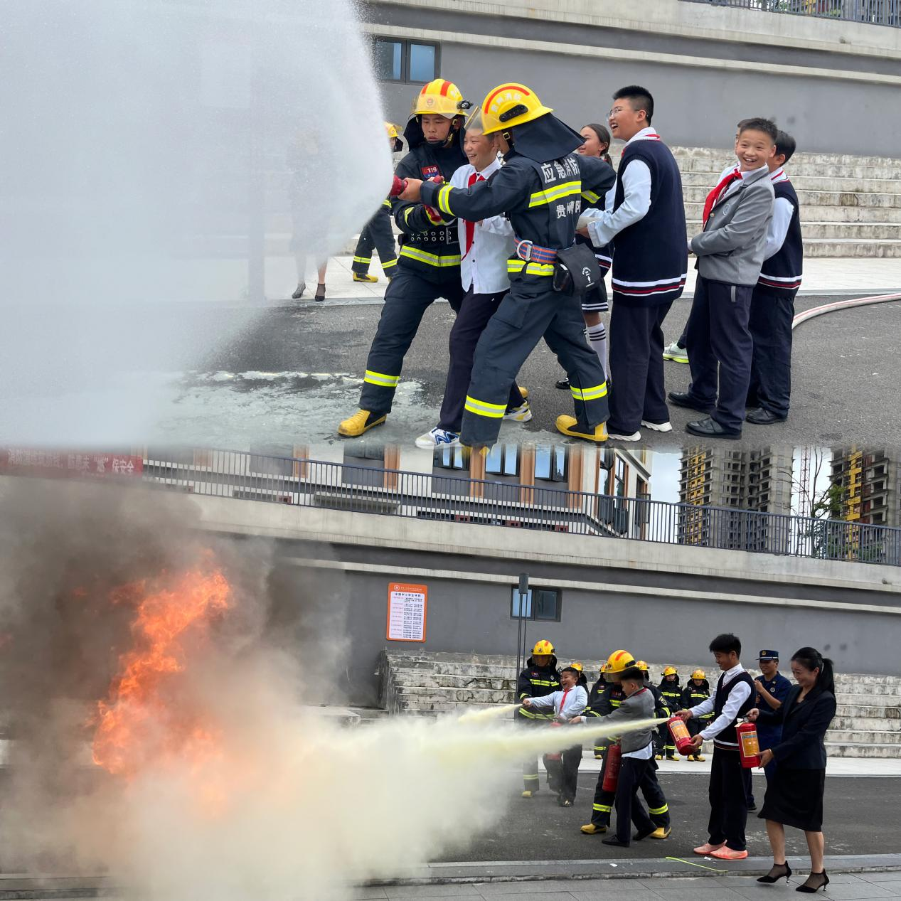 演练结束后,消防员又为师生们讲解了灭火器材的使用方法,并组织引导师生开展灭火器及多功能水枪灭火实操体验,使广大师生深入了解消防、重视消防,以丰富多样的实操体验增强学生学习消防安全知识的积极性和趣味性。