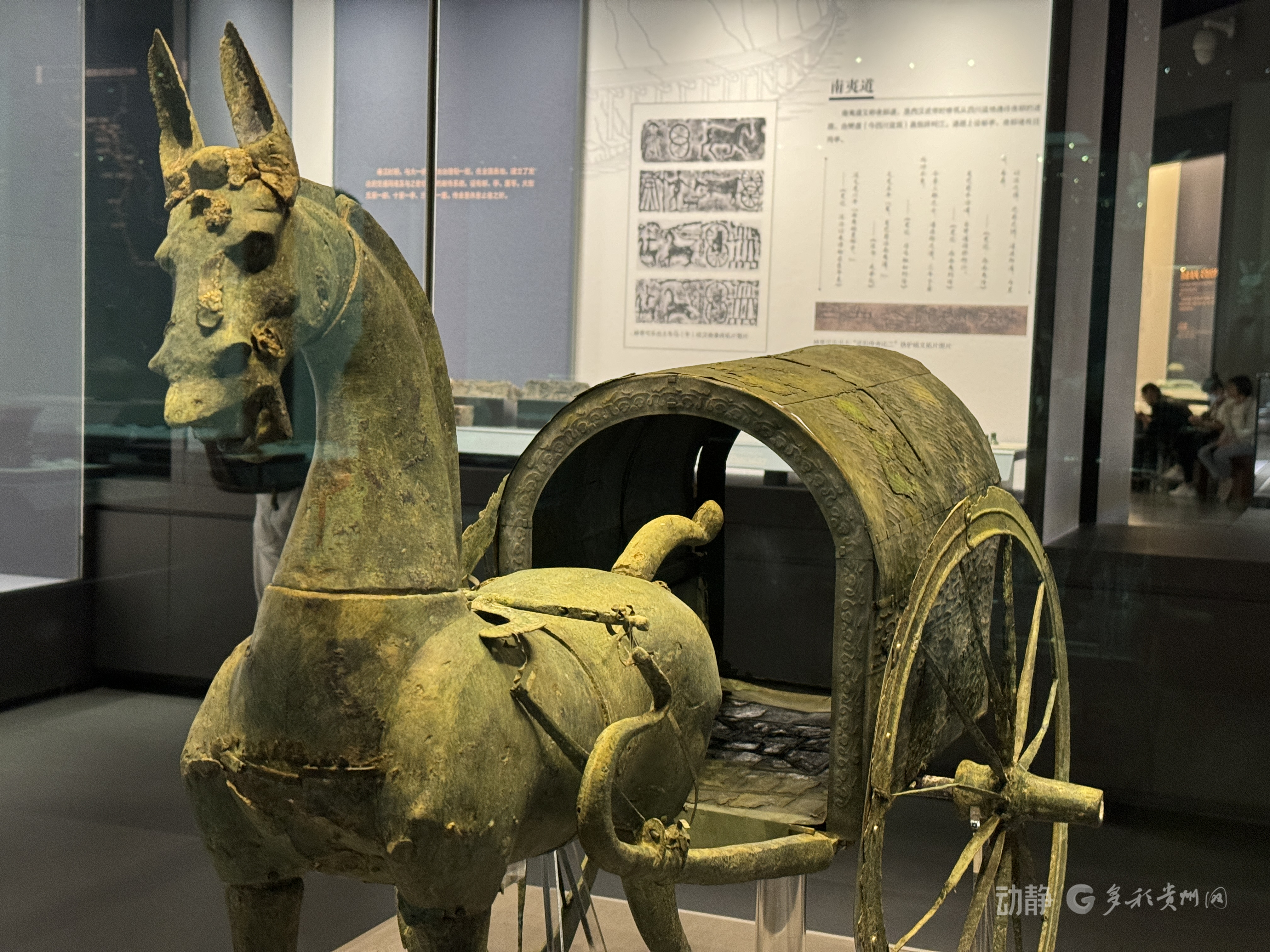 出土于兴义万屯8号墓的东汉铜车马(辎车),是迄今为止国内汉墓出土车马文物里最精美完整的一件,陈列于贵州省博物馆。1975年,被考古人员在墓室前的淤泥里发现,由一车一马两大部件构成,总长112厘米,通高88厘米。这辆铜车马标志性的特点,就是拱券形的车厢。其厢内底用铜箔铺垫,测量厚度仅为1毫米左右,工艺相当考究。