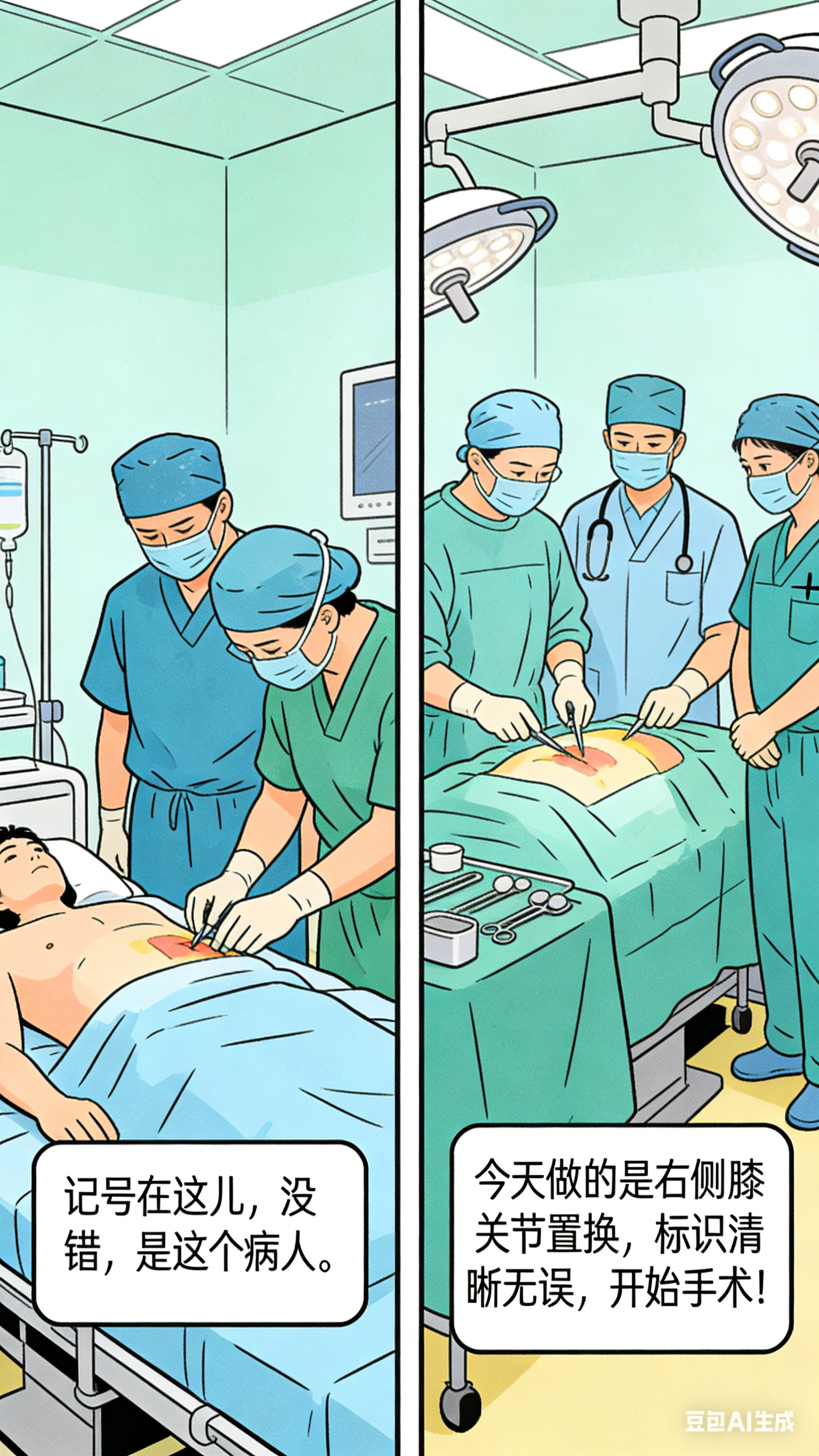 切皮前:主刀医生、器械护士、麻醉医生会停下来,进行最后一次“Time Out”(暂停核对)。大家盯着那个记号,齐声朗读:“今天做的是右侧膝关节置换,标识清晰无误,开始手术!”。