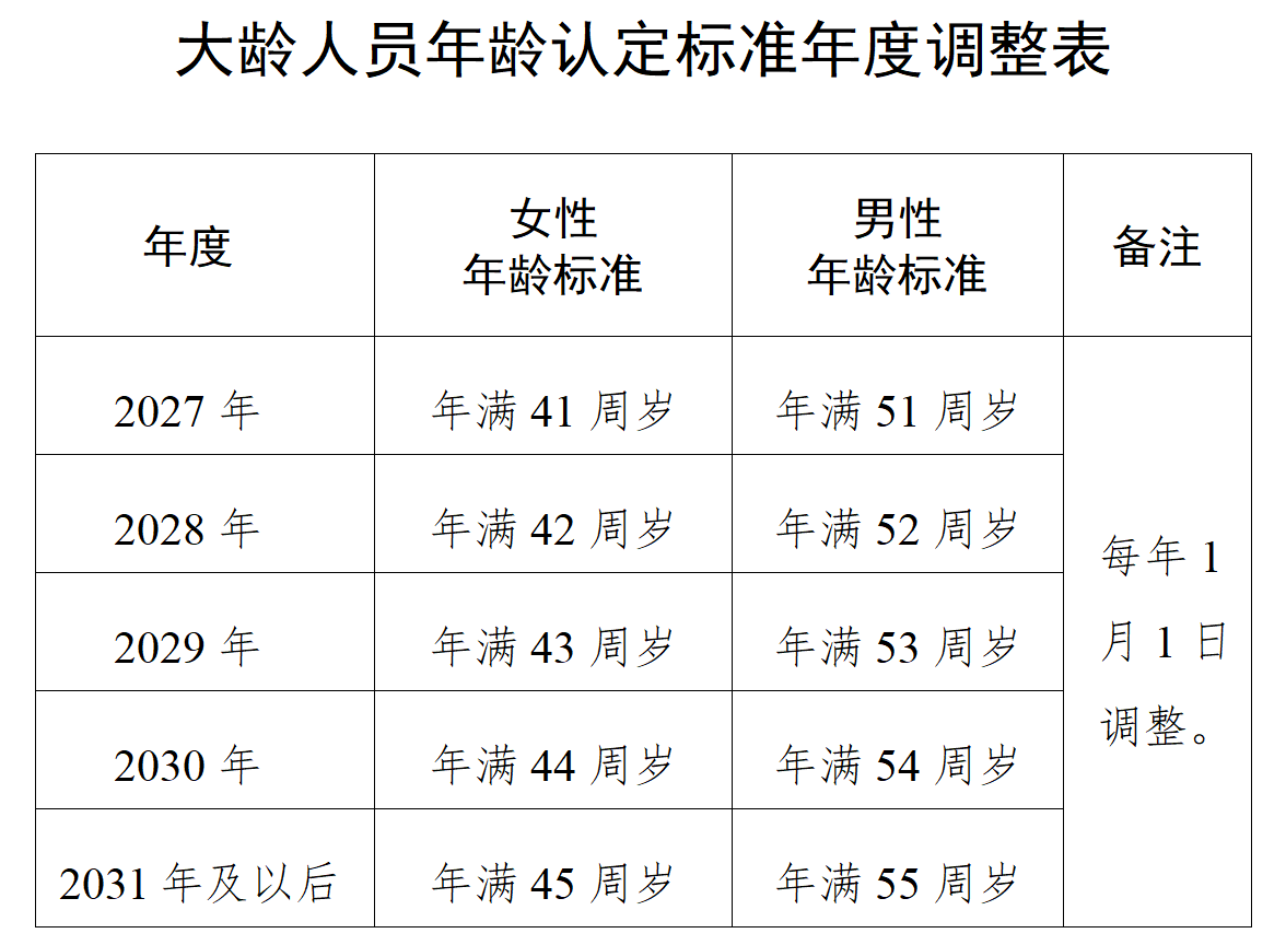 大龄人员。指女年满45周岁及以上、男年满55周岁及以上的失业人员(自2027年起,执行渐进式逐步调整,详见附表)。