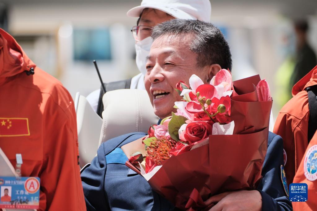 6月4日,神舟十五号航天员乘组平安抵京,航天员费俊龙手捧妻子为其送上的鲜花。新华社记者 李杰 摄