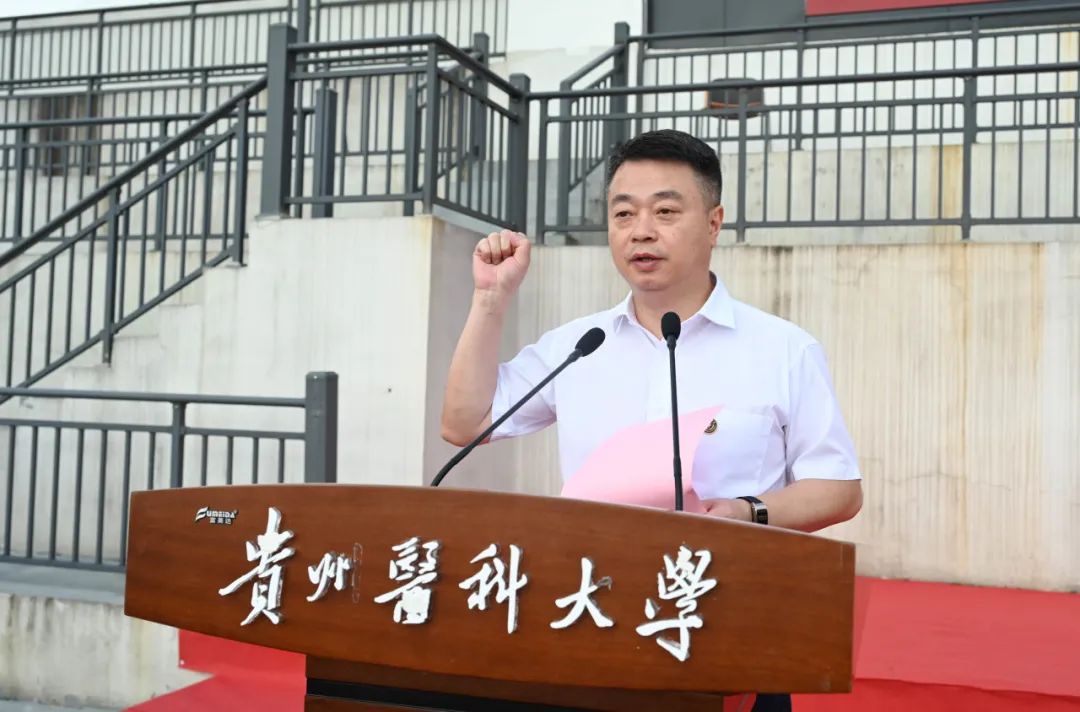 贵州医科大学党委书记汤磊作总结讲话。他寄语全体新生三点希望:一要心怀家国、传承使命,树立高远志向,将个人理想深植于医学事业之中,延续学校八十余年来“救国济民、挺身担当”的崇高精神血脉;二要脚踏实地、锤炼本领,在医学与科技深度融合的时代背景下,深耕专业、博采众长,以前辈之楷模为镜,扎实专业根基,拓宽学术的广阔视野;三要厚德载物、胸怀仁心,恪守“健康所系,性命相托”的誓言,以品德滋养身心,以公德涵养善心,以大德铸就灵魂,致力于成为有温度、有情怀的医者,用实际行动服务人民、贡献国家。