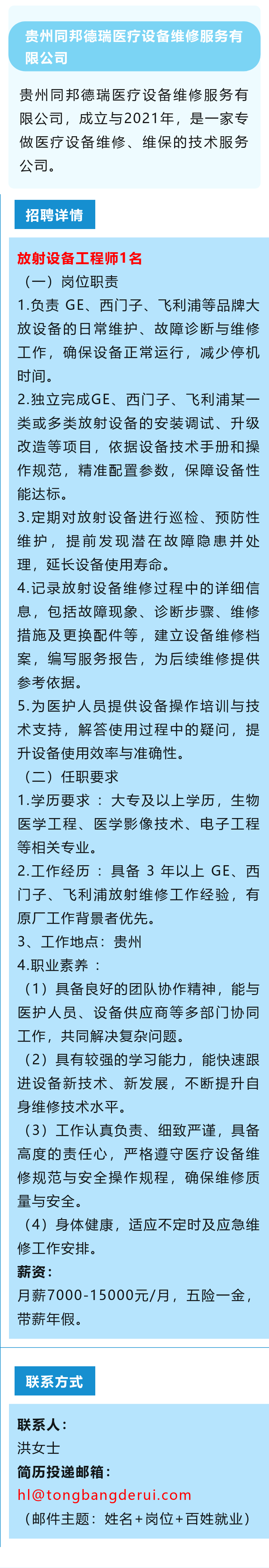贵州同邦德瑞医疗设备维修服务有限公司招聘!月薪7000-15000元!五险一金!