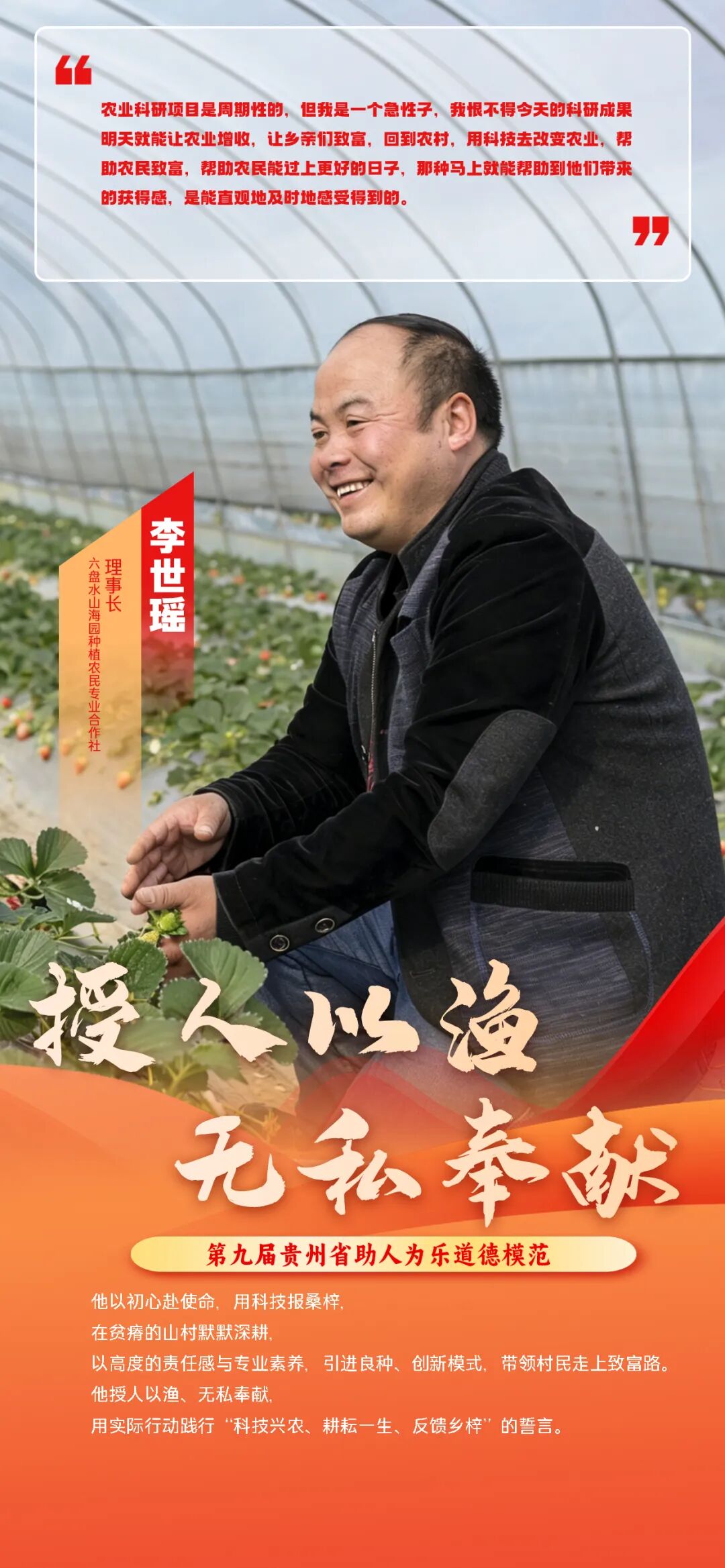 在4月11日举办的第九届贵州省道德模范评选中,来自六盘水市钟山区的山海园种植农民专业合作社理事长李世瑶因授人以渔的无私奉献精神,被评为第九届贵州省助人为乐道德模范。评委会认为他以初心赴使命,用科技报桑梓在贫瘠的山村默默深耕他授人以渔、无私奉献;以高度的责任感与专业素养,引进良种、创新模式,带领村民走上致富路;用实际行动践行“科技兴农、耕耘一生、反馈乡梓"的誓言。