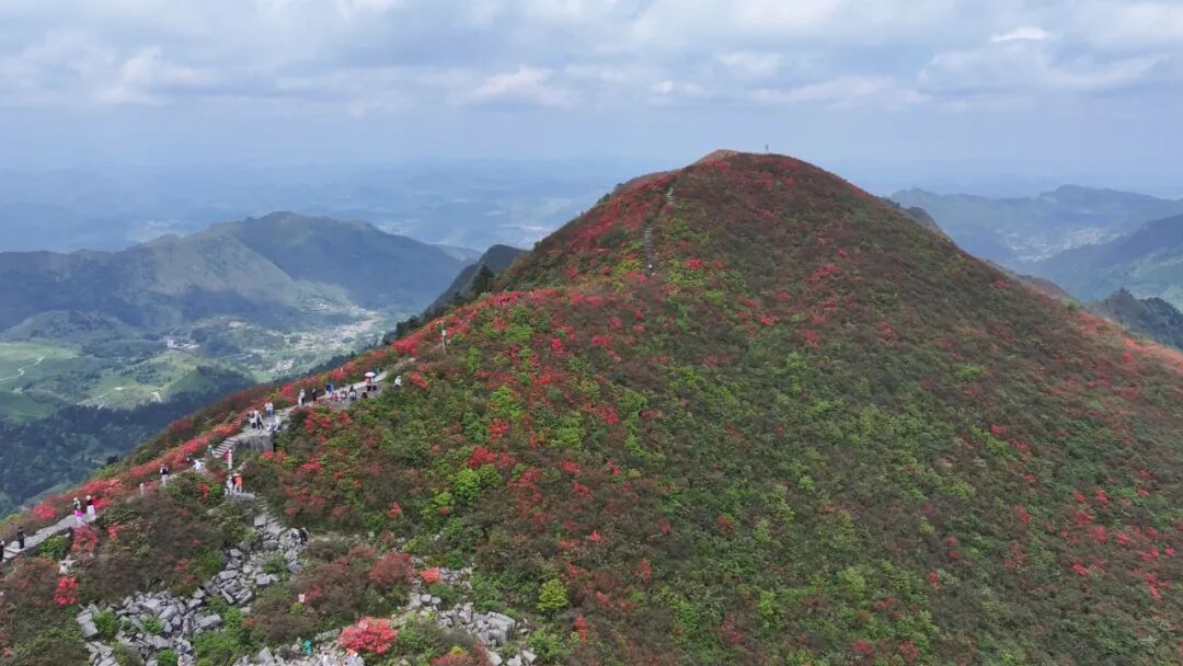 走进丹寨县龙泉山景区,绯红杜鹃从山腰向山顶次第铺展,将数十座山头染上层层红晕。伴着春日暖阳与山间云雾,来自国内外的游客们沿着登山步道向上攀登,徜徉花海,打卡拍照,尽享春日美好。