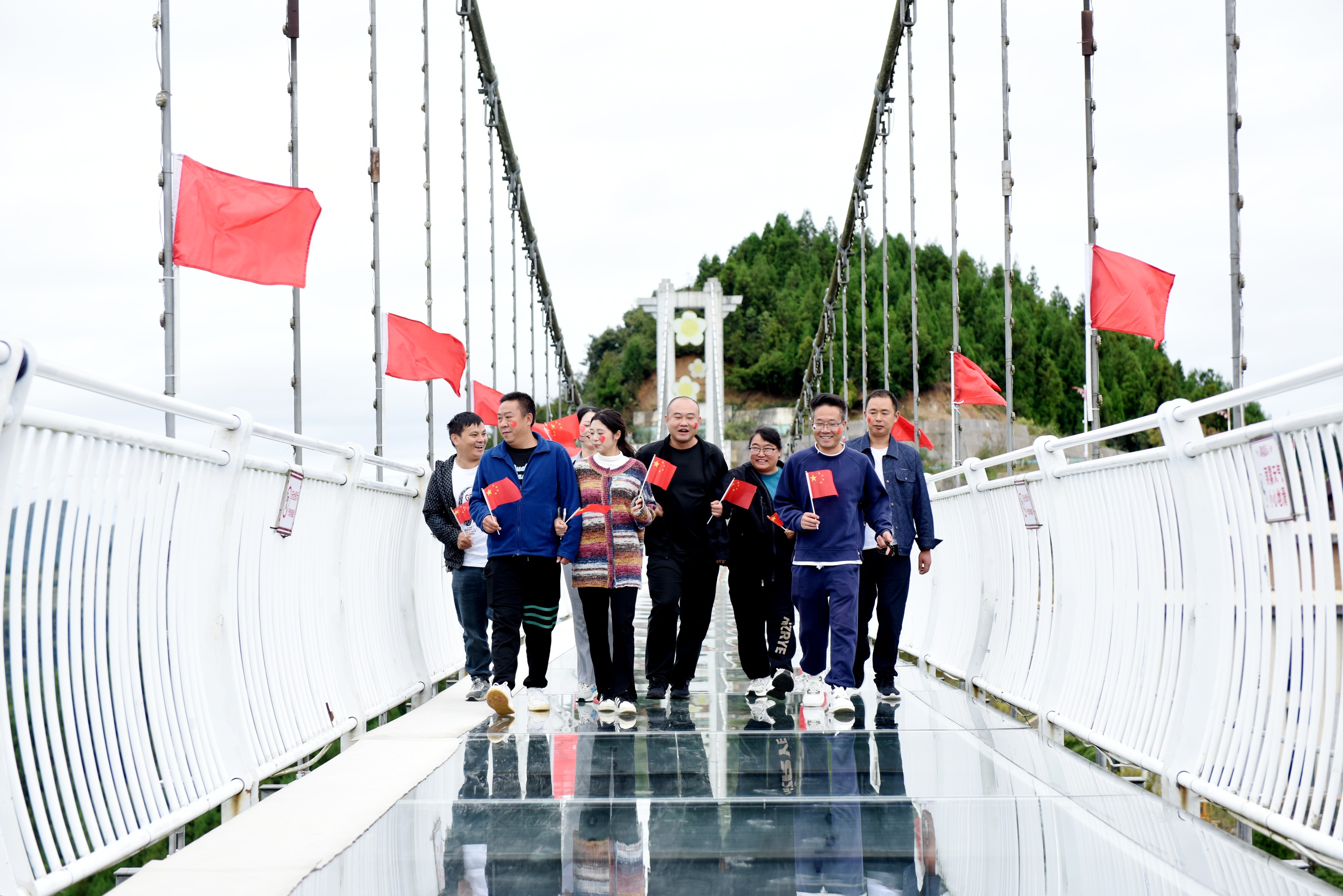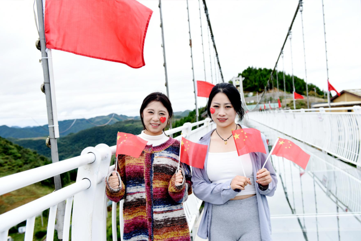 “来这儿既赏了美景,又能和大家一起自发为祖国庆生。玻璃桥两侧插满红旗,在国旗环绕中拍照、向祖国表白,心里特别激动,真心祝愿我们伟大的祖国繁荣昌盛!”来自武汉的游客刘小霞动情说道。