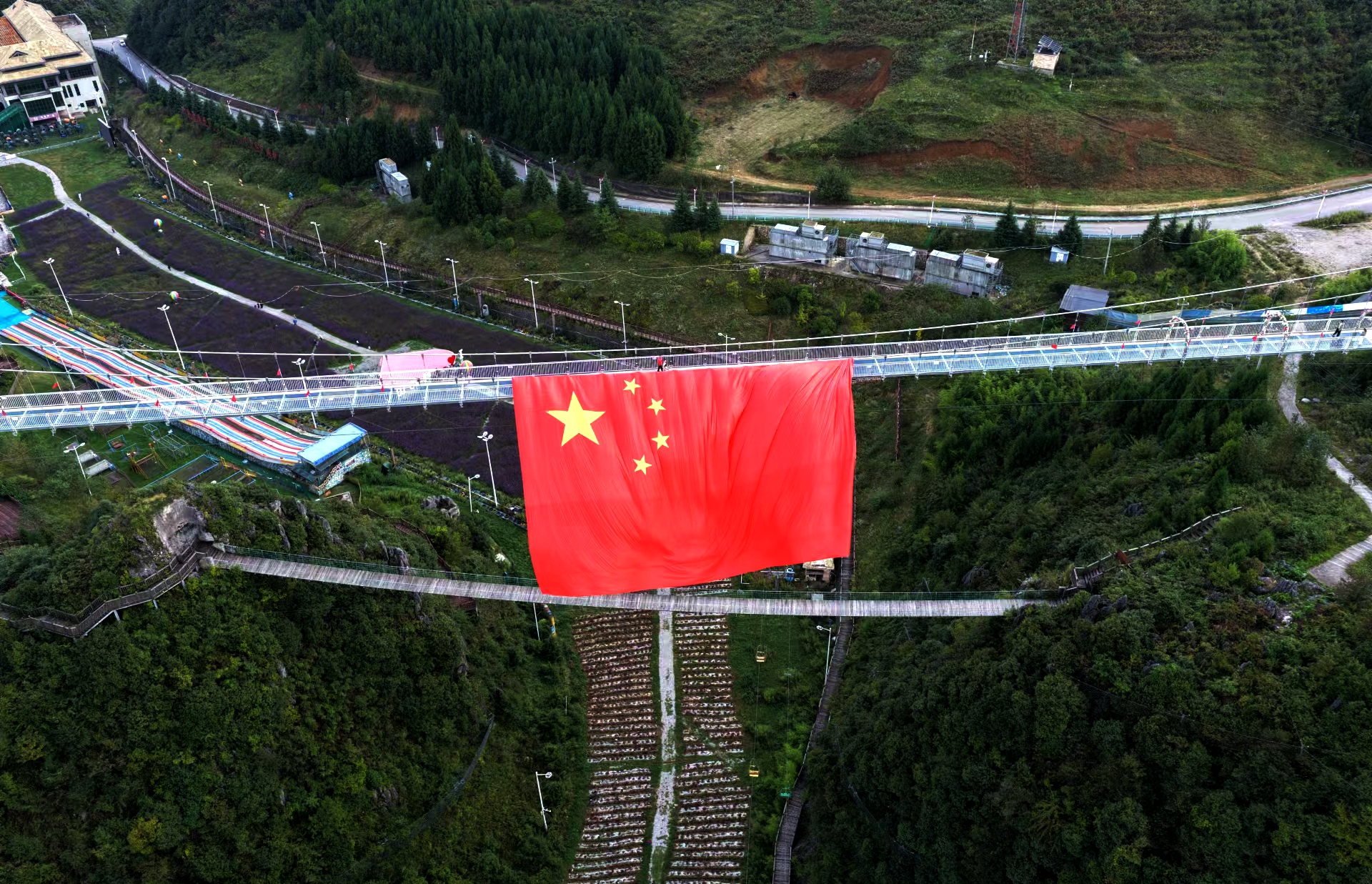 当日15时,现场游客自发组织,二十余人携手托起一面600平米的巨幅国旗,从高空缓缓放下。随着国旗在步行玻璃桥上徐徐展开,鲜红旗帜与山间秋日美景交相辉映,格外夺目,既传递出大家对祖国的无限热爱,也让现场国庆氛围愈发浓厚。