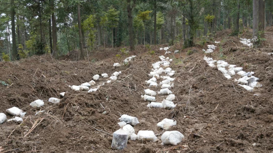 走进孙家坝林下灵芝种植示范基地,只见土地翻整一新,露出的褐色湿润土地散发着阵阵土腥味,一个个白色菌包整齐排布,前来务工的村民分工有序,有的忙着用锄头整地、有的小心翼翼的撕掉菌包上的包装膜、有的细致地为菌包覆土,一锹一铲间,沉睡的山林正被唤醒为“聚宝盆”。