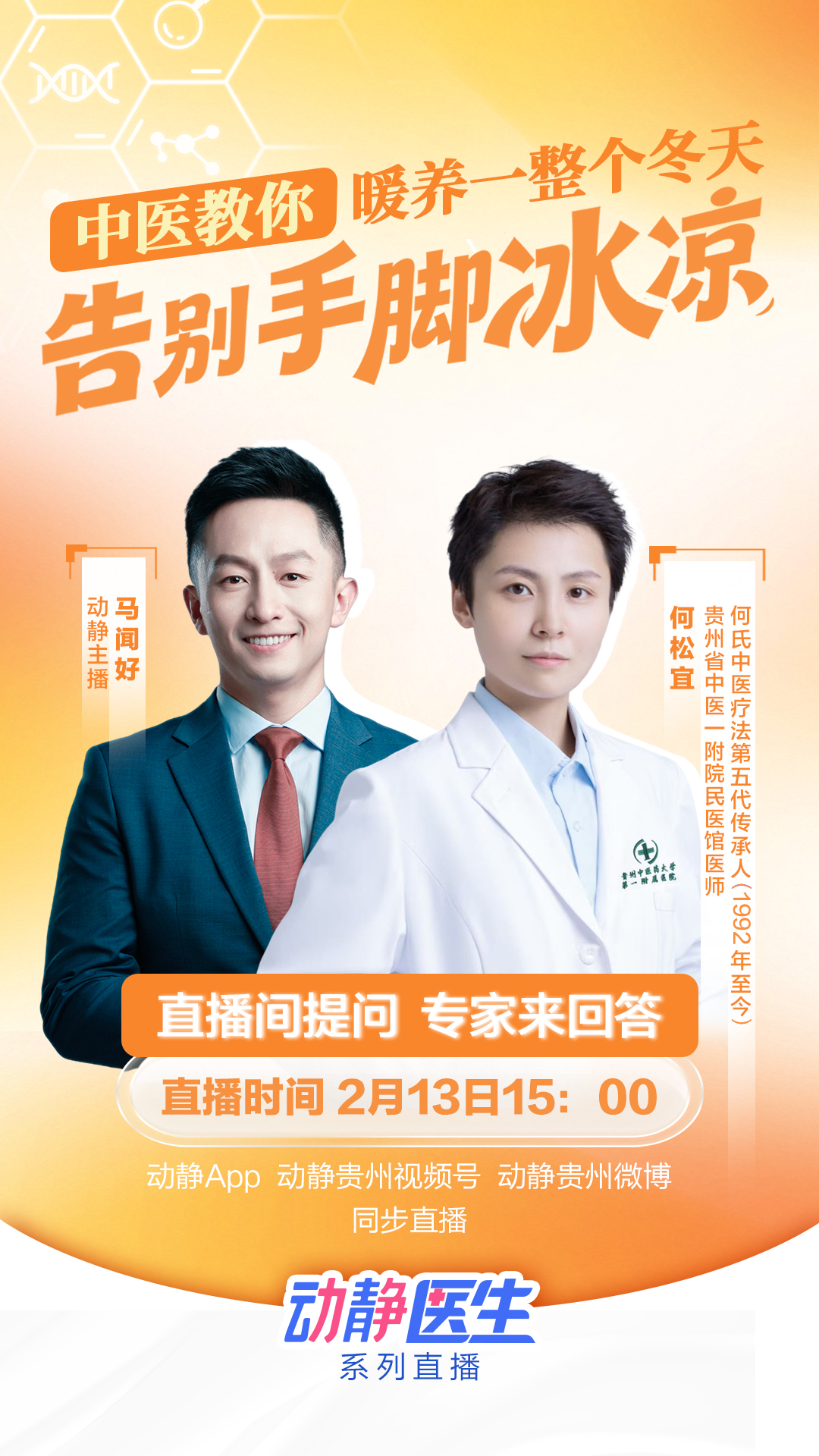 动静医生丨暖身祛湿,喝对饮品更暖和 2026-02-14 09:57 贵州省中医一附院民医馆医师、何氏中医疗法第五代传承人何松宜:日常可以养成温和食补的习惯:能接受生姜的,可以取少量姜汁,加入温水稀释后小口慢饮。也可以饮用薏仁米熬煮的水,还可以搭配红枣、枸杞、茯苓等食材,茯苓具有祛湿的作用,五指毛桃也是不错的选择。点击海报查看直播↓↓↓ 记者: 刘泳林 编辑: 刘泳林 责编: 杨霄 编审: 李铁流